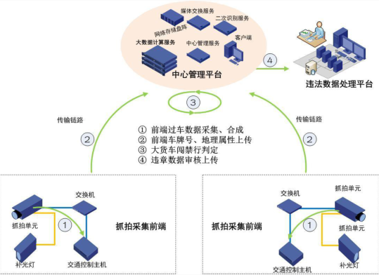改變以往大量交警人工查控模式,通過道路車輛智能監(jiān)測記錄系統(tǒng)及智能視頻分析處理技術(shù),后端平臺(tái)可以對(duì)進(jìn)入視頻檢測區(qū)域的車輛進(jìn)行抓拍、車輛識(shí)別、報(bào)警、記錄保存車輛通行的信息,篩選出違反限行的車輛并將限行違法數(shù)據(jù)上傳至交警違法處理平臺(tái)。